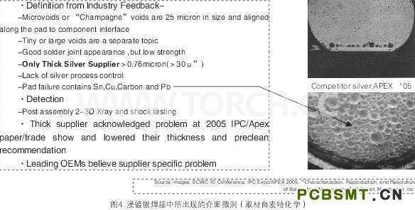 此種介面性微空洞不但在PCB浸鍍銀的焊接中出現(xiàn),也會發(fā)生在OSP與ENIG等皮膜之焊接中,其根本原因到目前為此尚未徹底搞清楚。不過也找到某些確定的相關(guān)成因,例如厚度加厚者微空洞也較多(尤其當(dāng)厚度超過15μin者),然而某些配方也未必全然如此。此外底銅面的粗糙度也是原因之一,通常愈粗愈糟。且還發(fā)現(xiàn)與配方中的有機物含量與成份有關(guān),某些有機物則容易伴隨銀金屬產(chǎn)生共鍍而存在于皮膜中。不過這種假設(shè)性的理論,曾經(jīng)通過某些品牌商(OEM)、代工組裝業(yè)者(EMS)、PCB業(yè)者,與藥水供應(yīng)商等,所共同組成聯(lián)盟的多次合作研究,竟然沒有一次模擬成功,當(dāng)然也就無法將微洞徹底予以排除了(見下頁圖4)。