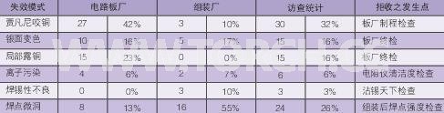所訪查的對象是來自64家PCB廠及29家組裝客戶共93個參與的業(yè)者,從其失效或被拒收板類中,可歸納出有關(guān)浸銀皮膜的六個主要缺失,下表1中即按其重要性而對其失效內(nèi)容加以分類。