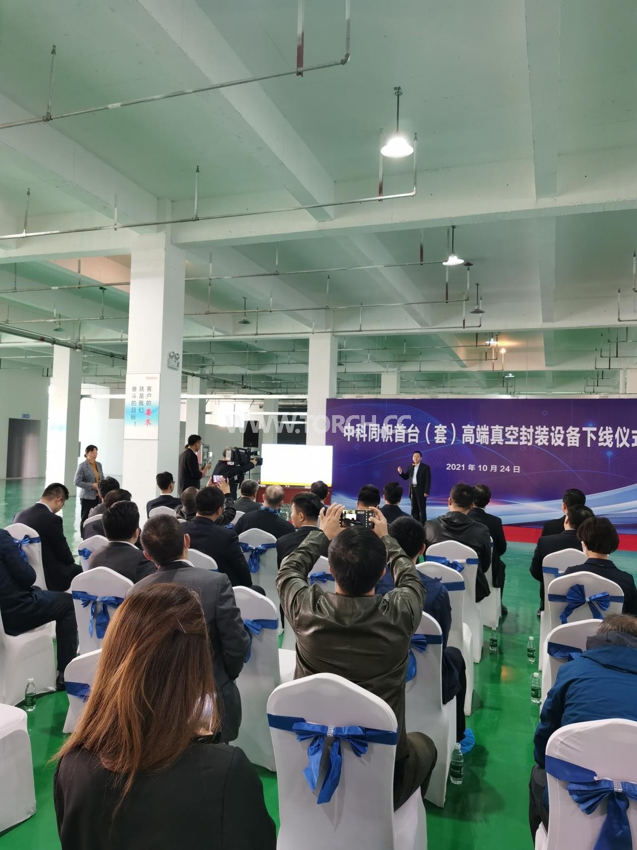中科同幟半導(dǎo)體(江蘇)有限公司總經(jīng)理趙永先在為大家做了產(chǎn)品介紹后,又帶領(lǐng)大家參觀了設(shè)備的生產(chǎn)車間。趙永先表示,從現(xiàn)在投產(chǎn)開始,中科同幟將在泰興工廠進行產(chǎn)品的規(guī)模化生產(chǎn)和工藝研發(fā)測試,更好的為華東地區(qū)的客戶服務(wù)。除了新下線設(shè)備V8H以外,江蘇公司還生產(chǎn)其他半導(dǎo)體封裝設(shè)備,預(yù)計年產(chǎn)能300臺左右,并可為客戶提供全自動IGBT錫膏工藝封裝測試服務(wù),其所有設(shè)備皆由中科同志科技研發(fā)制造。